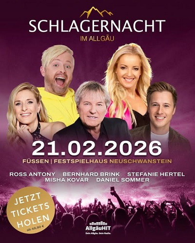 Am 21. Februar kehrt die Schlagernacht im Allgäu zurück – in der märchenhafte Kulisse des Festspielhauses Neuschwanstein in Füssen.